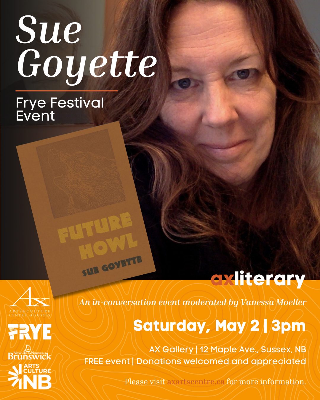 Join us on Saturday, May 2nd at 3pm in the AX Gallery for a special afternoon. In partnership with the Frye Festival, AX will be hosting Sue Goyette. Moderated by Vanessa Moeller, this event will feature readings from Goyette’s latest collection Future Howl.