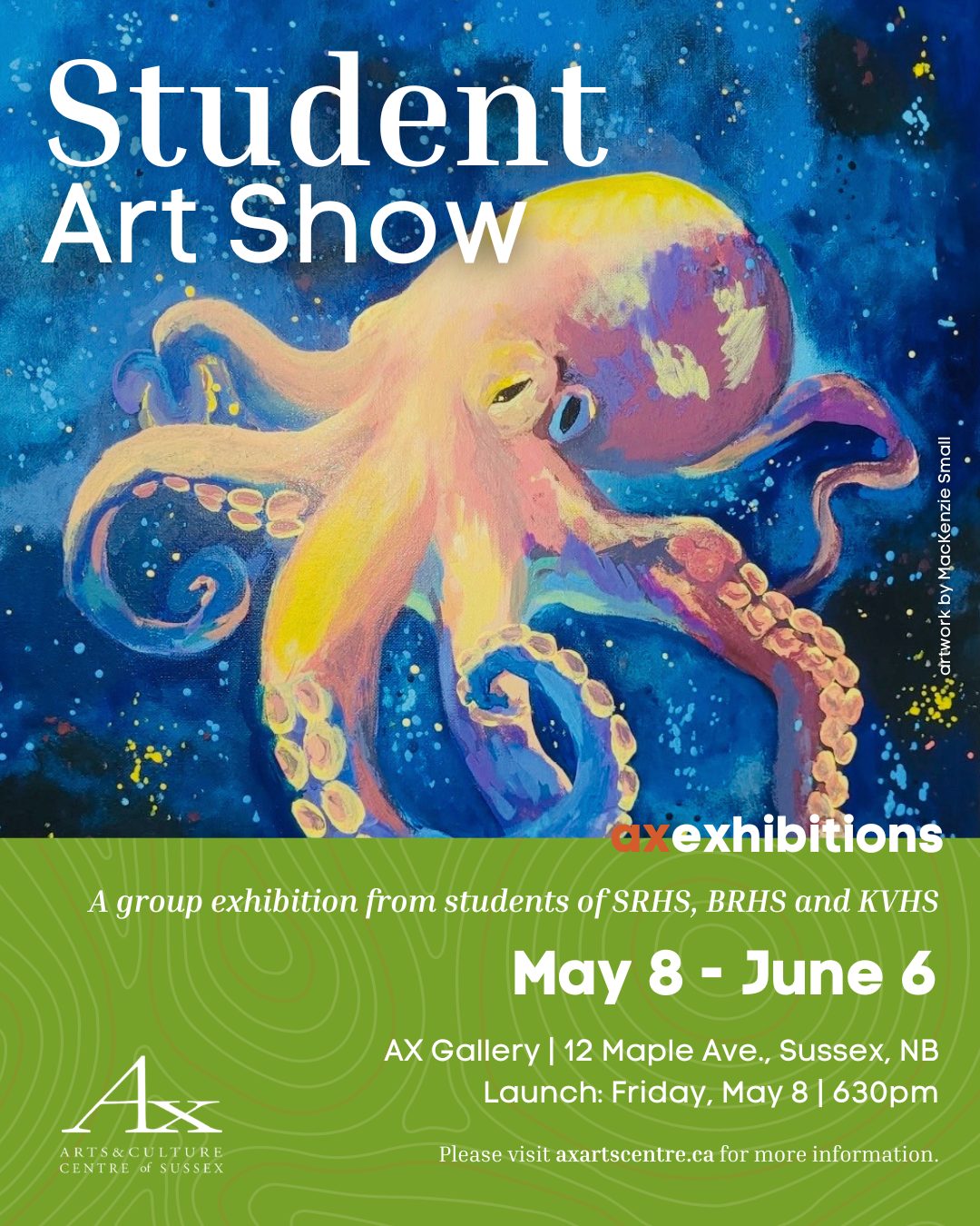 AX, the Arts and Culture Centre of Sussex, is thrilled to showcase the creativity and talent of young artists in our Student Art Show, running from May 8 to June 6. Featuring a diverse collection of works created by students from Belleisle Regional High School, Kennebecasis Valley High School and Sussex Regional High School. This exhibition highlights the passion, skill, and artistic expression of the next generation.